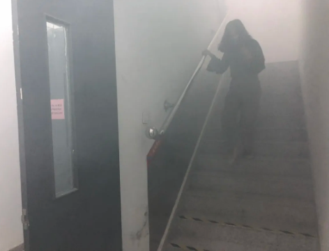 下午16時,消防演練正式開始。隨著火災警報鈴聲響起,樓梯間濃煙彌漫,全體人員在安全員的指揮下用濕毛巾捂住口鼻,彎腰低頭,沿消防通道進行緊急疏散。參與演練的人員第一時間撤離到5號樓外北側安全地帶,并進行人員清點、確認。